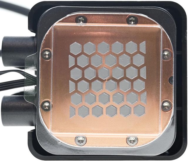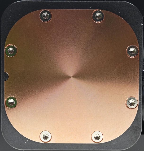 ▼水冷頭處理器接觸面外圍使用星形沉頭螺絲固定,尺寸55.8×55.8mm
