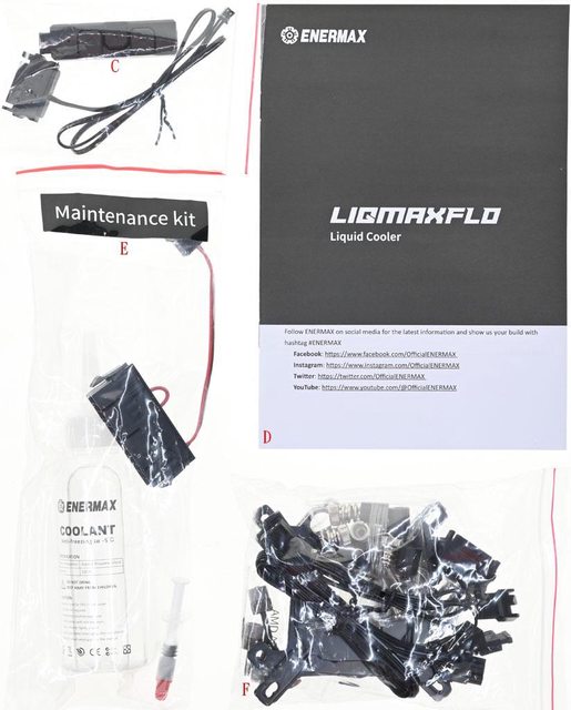 ▼其他還有燈光控制盒/電源線(C)、安裝說明書(D)、水冷維護套件(E)、安裝配件包(F)