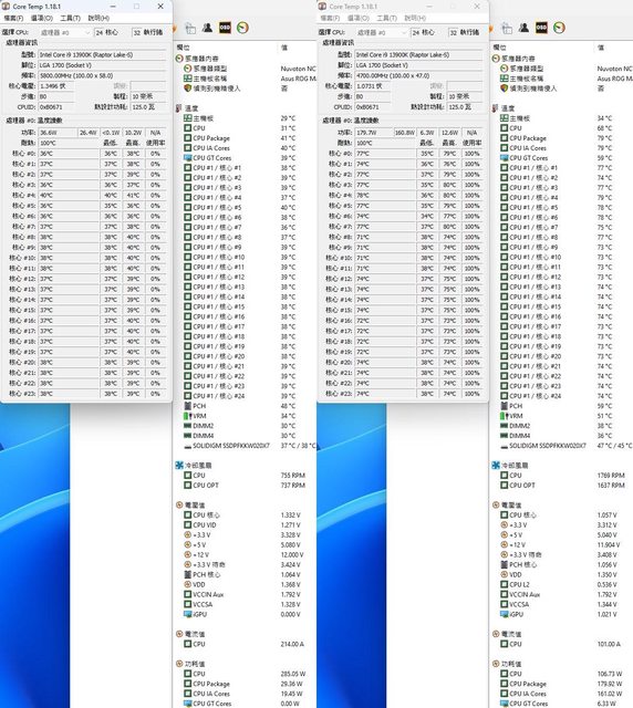 ▼功耗限制200W下待機(左)及高負載(右)的CORE TEMP及AIDA64感測器畫面