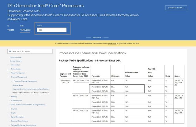 ‧ 在 002 版本裡,13TH 8P + 16E 的 PL1 和 PL2,分別是 125W 和 188W,這是 INTEL