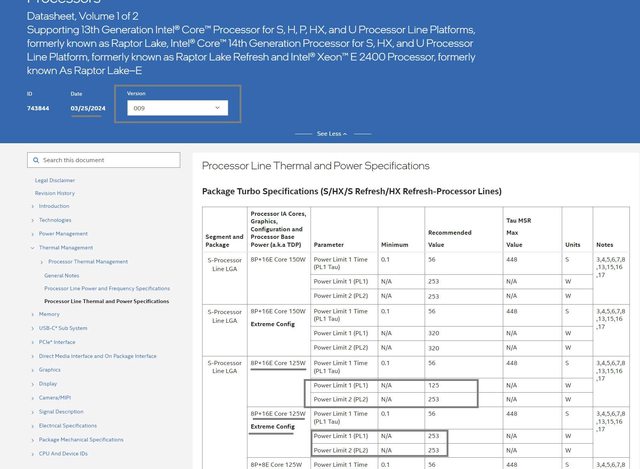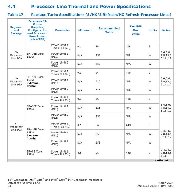 W 的 8P+16E 例如 i9-13900KF 定出 PL1 = 125W / PL2 = 188W / ICCMAX = 249A / AC_