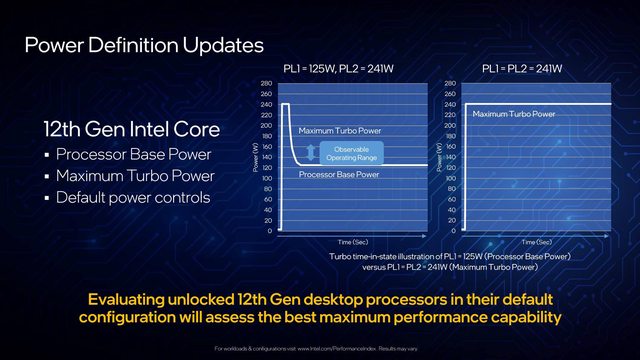 ,例如 i9-12900K 可以採用 PL1 = 125W / PL2 = 241W,也可以採用 PL1 = PL2 = 241W,