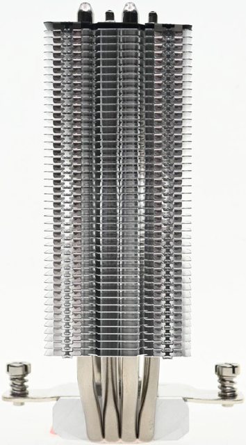 ▼散熱器本體底座兩邊各伸出4支直徑6mm無重力熱導管,並在熱導管上安裝45片鰭片