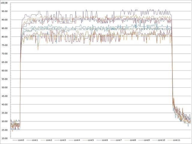 ▼高負載30分鐘CORE TEMP溫度記錄圖