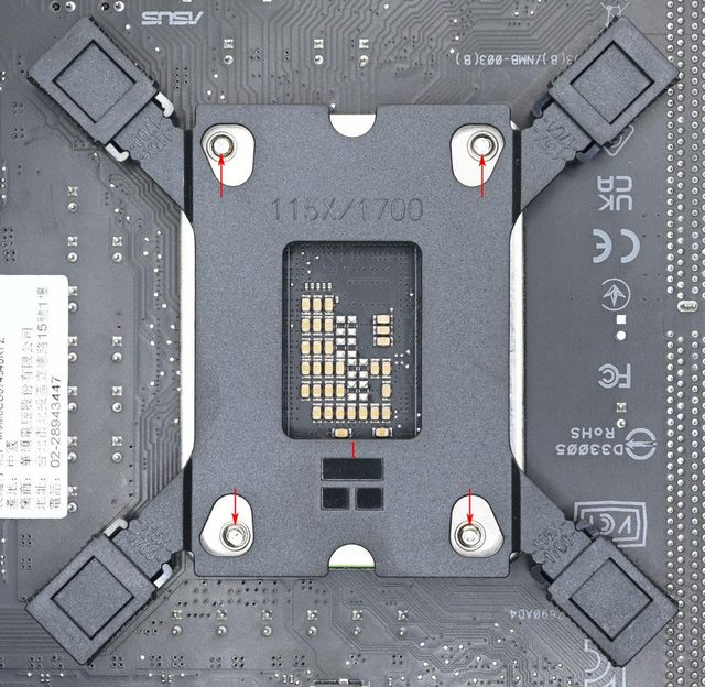 LGA1200/115x黑色套管套上固定鎖點(3),放上托架(4),用4個Intel托架固定螺絲鎖緊