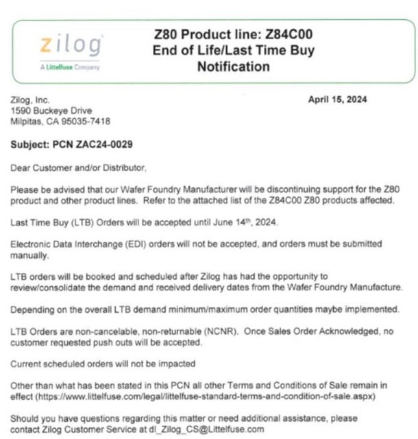 最後購買」(LTB)訂單。Zilog 將根據客戶的需求處理和安排 Z80 的 LTB 訂單,而