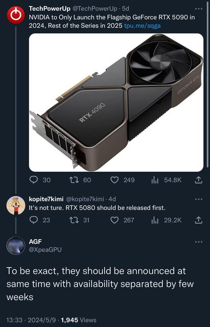 50系列5080跟5090今年會一起發表 但5080會比5090早幾週上市 這個以往都一樣 同時發表但不同時間上市 除了40系列是4090先上才上4080 而且隔了一個月 其他20/30系列都是80先上才上90 目前據稱有5種核心 GB202 GB203 GB205 GB206 GB207 5090 5080 會分別搭載GB202跟GB203 使用台GG 4NP製程 且支援GDDR7 GB202滿血的核心為GB203的2倍(24576 cores vs 12288 cores) 但5090只會啟用21760~23040之間的核心數 滿血應該是跟40系列一樣留給Server級的 你各位期待新卡的 還久 反正上市一定價格很死 除非主攻頂級 不然現在買一買就好了 — https://i.imgur.com/xQz9xf5.jpeg