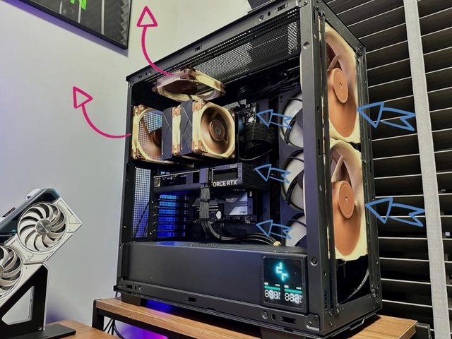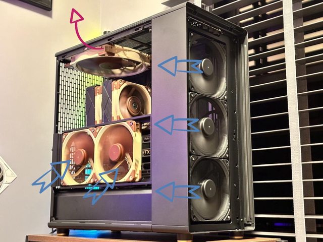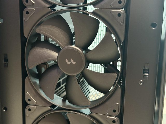 顆14cm風扇進氣,熱氣則由後方及上方14cm風扇排出,總共5進2出共7顆風扇的配置。