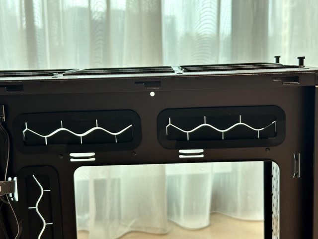 電源倉上方有長條通風開孔,能藉由這些開孔安裝2顆12cm風扇,但因為Mesh板已經附側