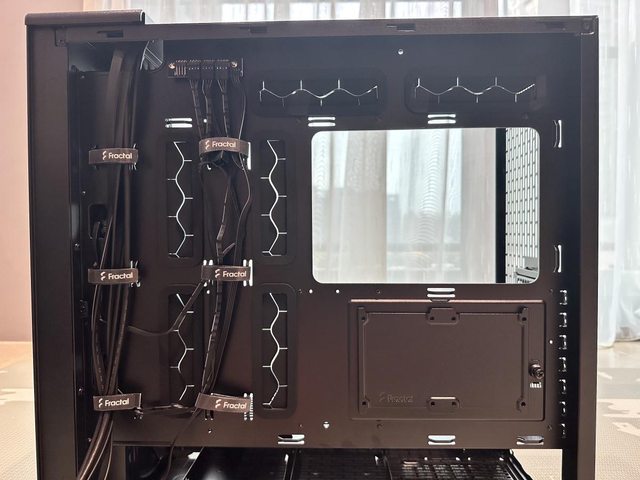 機殼背面部分設置兩個理線區,各走線開孔都有設置橡膠保護套,主機板後方則一樣具備