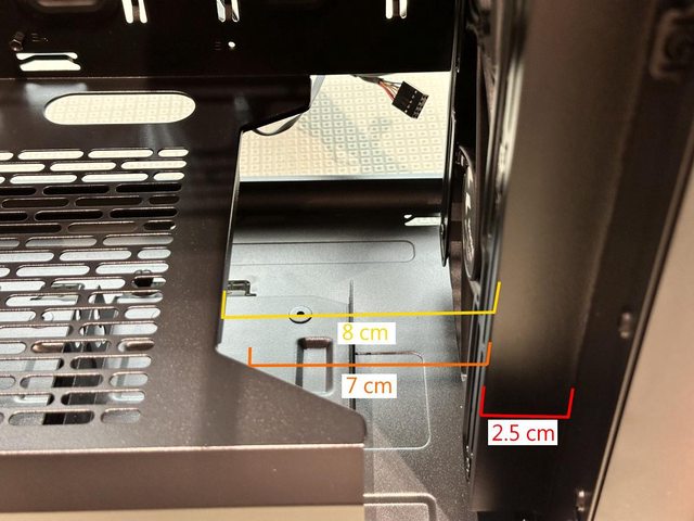 依個人測量,前方風扇框體自成一區,深度為2.5cm(紅色),如果裝14cm冷排則深度可到
