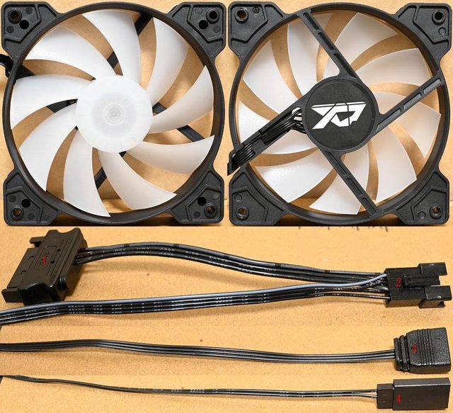 ▼120mm ARGB主控風扇,乳白色9葉片扇葉軸心內有發光LED,扇葉外框貼紙有商標,風扇