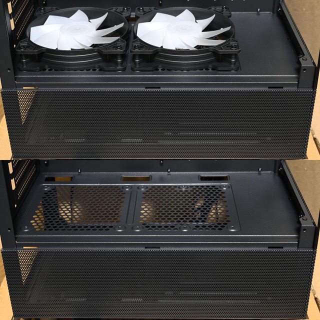 ▼電源艙頂部預裝2個120mm ARGB從控反向風扇,靠近底板有3個長方形穿線開口