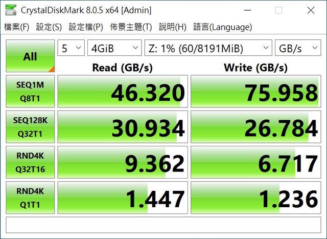 RAMDISK 讀取 46.320GB/s 寫入 75.9580GB/s