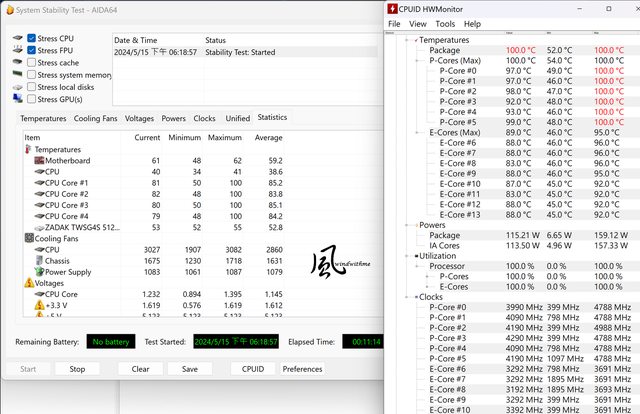 P-core約92~100度,時脈約4~4.3GHz;E-core約83~88度,時脈約3.2~3.4GHz。