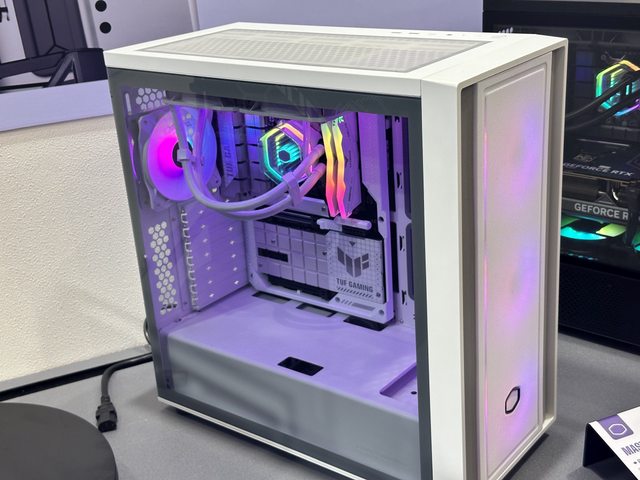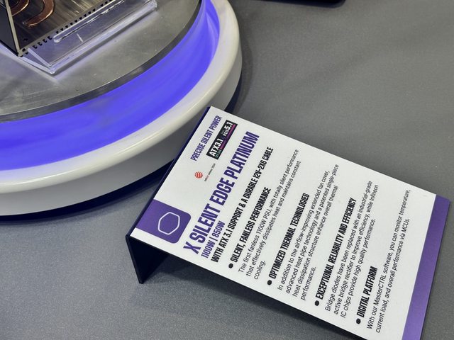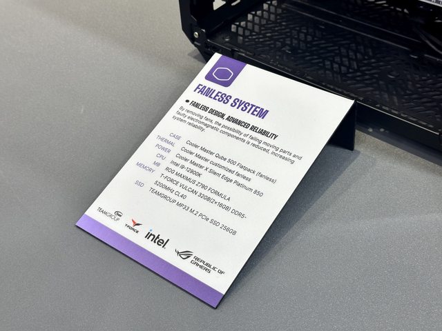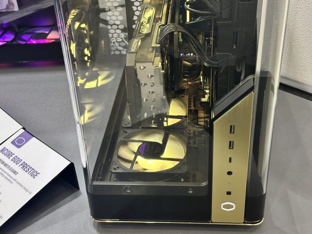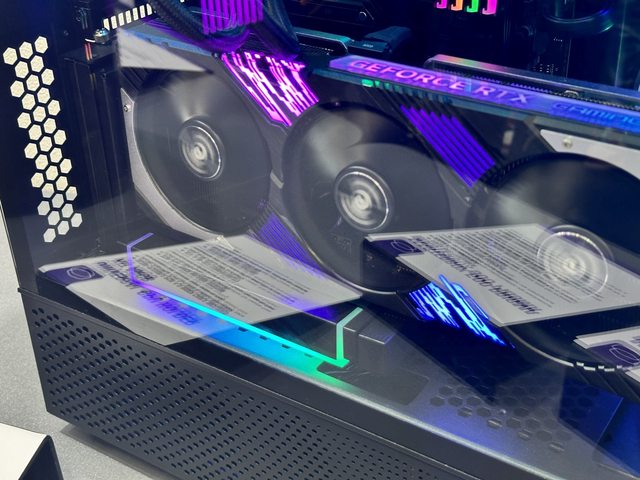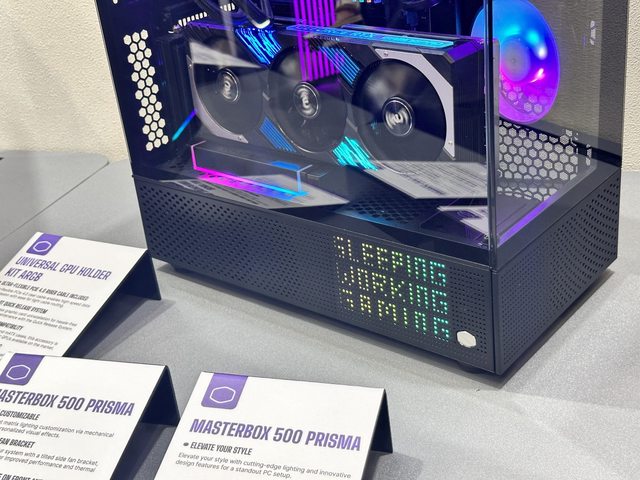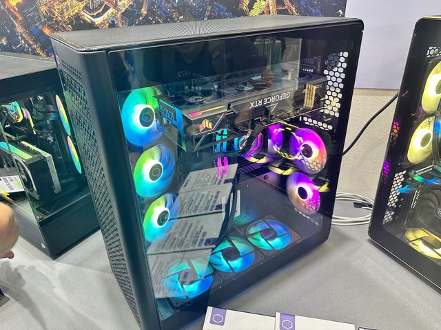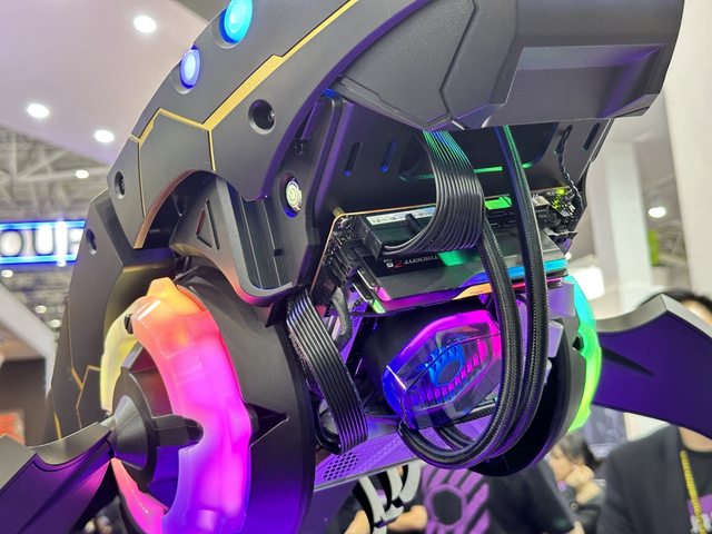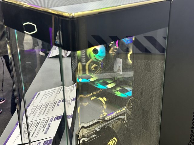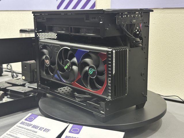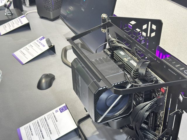 解說人員強調內部使用酷碼新款帶ARGB燈效的顯示卡直立架,可惜個人的設備沒辦法拍到