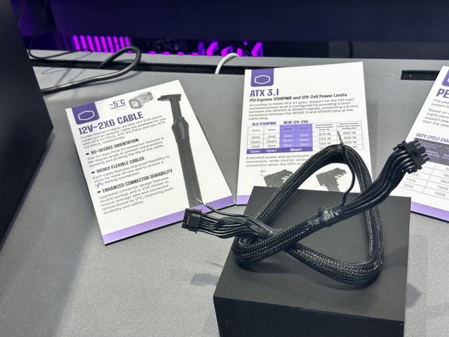 酷碼新款電源出廠都已搭配新版12V-2x6 直角電源線,據現場人員介紹酷碼將接頭金屬部