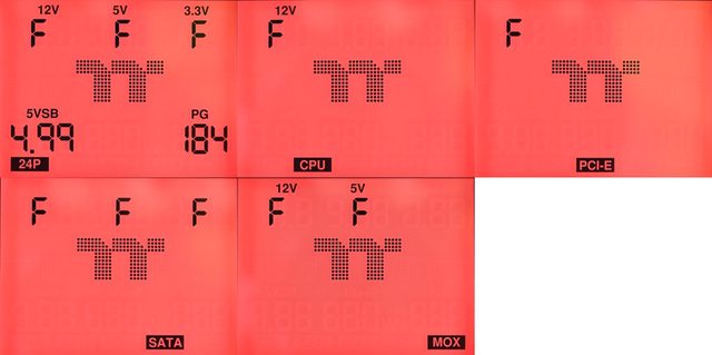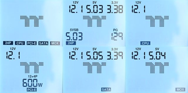 ),再按一下開關會切換至MOX頁面並顯示Molex(大4P)的+12V/+5V電壓(右下),再按一下