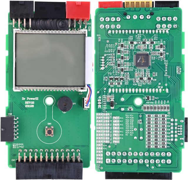 ▼內部電路板正面有插座、LCD螢幕、蜂鳴器、輕觸開關,電路板背面有Microchip