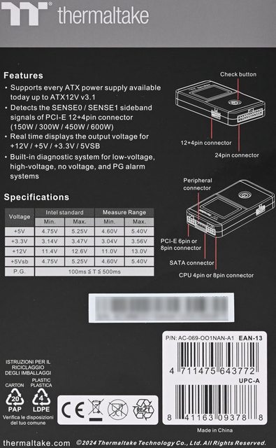 Thermaltake Dr. Power III電源檢測器具備ATX 24P、CPU12V 4P/8P、PCIE 6+2P、PCIE