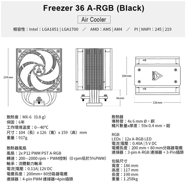 ARGB版,本篇開箱其中散熱片採用黑色塗層,搭配雙P12 ARGB風扇的Freezer 36 A-RGB