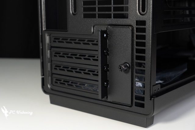 機殼後方可以安裝 120 mm 的風扇以及最多四槽 PCIE 設備,上半部有電源供應器延長插座