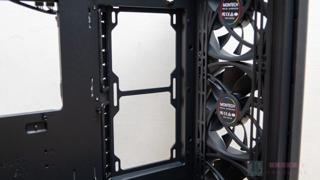 打開側板後內部配置相當清楚明瞭,可看到內建 PWM & ARGB 集線器、側邊風扇框架、線材