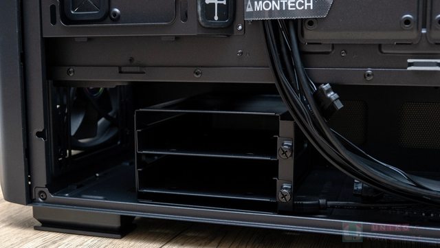 碟架的鎖點,有 2 段位置可以選擇,代表著前方也可以安裝水冷排加風扇。