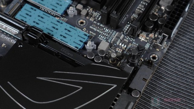左上巨大的 VRM 散熱器有 ROG 和 MAXIMUS APEX ENCORE 字樣驗明主機板正身,CPU 插座