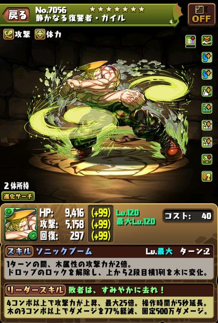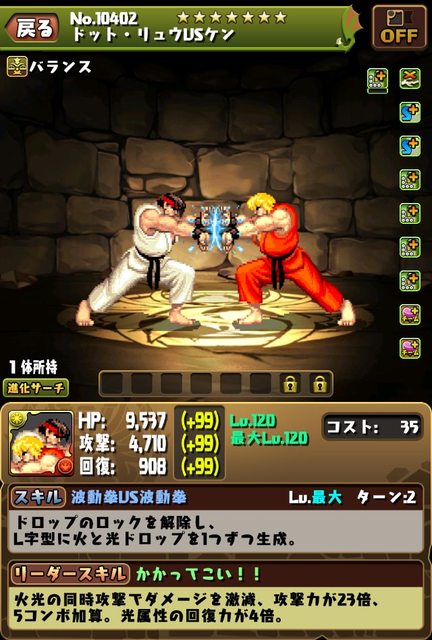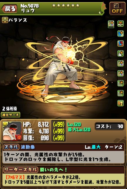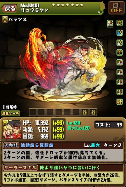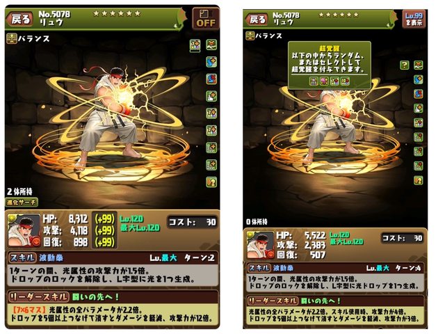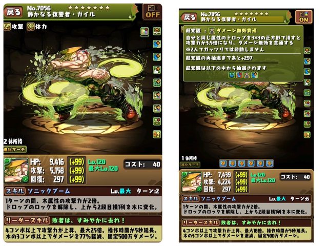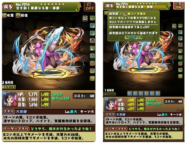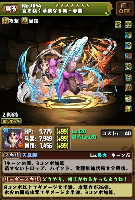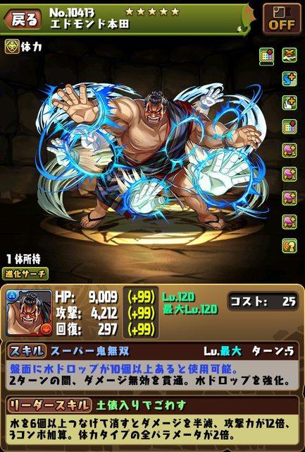 水珠6顆以上消除時,受到傷害半減、攻擊力12倍、Combo數+3。