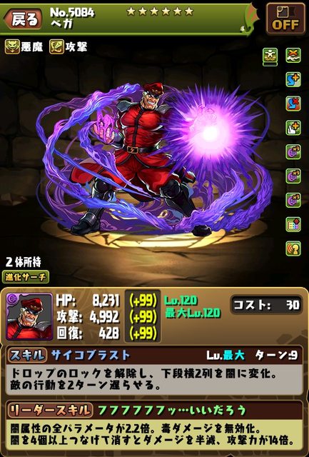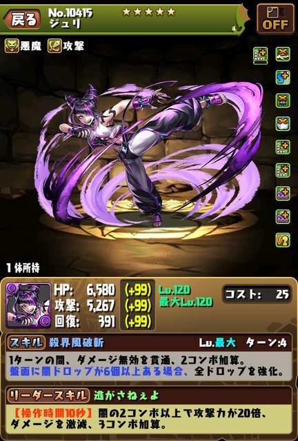 闇珠2串以上消除時,攻擊力20倍、受到傷害激減、Combo數+2