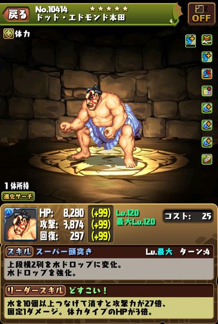 水珠10顆以上消除時,攻擊力27倍、追打傷害1。