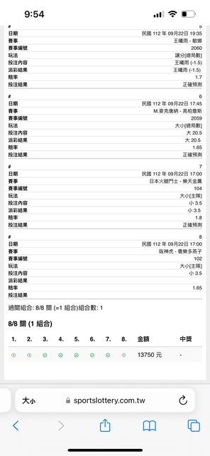 今天看比賽選了八關串一起 多多阪神早早延賽會變*1 串了中職兩場小分超抖的 還有一場韓職小分也是超抖的 隨著天母比賽結束 我等明後天派彩結果 我再重發一篇發飲料 分享喜悅給大家 https://i.imgur.com/9P8AT6B.jpg