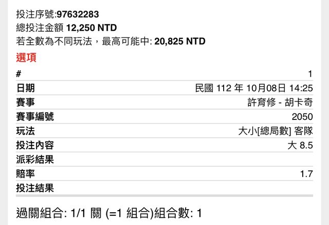 直上個人大不用怕 對手也只會發球 看好第一盤直接打到搶七 連假第二天開心看球 威剛還我錢~ -- ※ 發信站: 批踢踢實業坊(ptt.org.tw), 來自: 36.230.21.13 (臺灣) ※ 文章網址: https://ptt.org.tw/SportLottery/M.1696740534.A.BBE