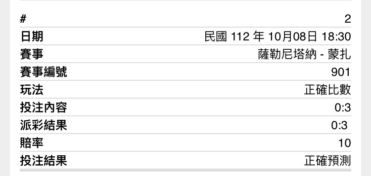 薩勒尼塔納 0 蒙扎 3 9“ 18” 82” HT 0:2 FT 0:3 ----- Sent from JPTT on my HTC U12 life. -- ※ 發信站: 批踢踢實業坊(ptt.org.tw), 來自: 101.137.92.116 (臺灣) ※ 文章網址: https://ptt.org.tw/SportLottery/M.1696759208.A.1AC