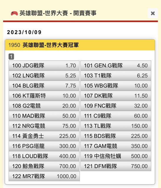 今年世界賽準備要開打啦! 賽前賠率記錄一下! https://i.imgur.com/cTEUGJW.jpg