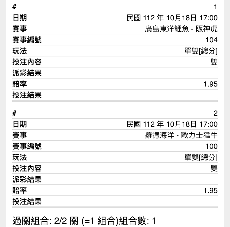 推 jjking404: 幹原本要買羅德單大虎單大 結果睡過頭 42.76.42.116 10/18 19:40