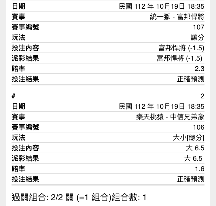 樂天3 中信4 統一 富邦5 ----- Sent from JPTT on my iPhone -- ※ 發信站: 批踢踢實業坊(ptt.org.tw), 來自: 42.73.62.46 (臺灣) ※ 文章網址: https://ptt.org.tw/SportLottery/M.1697710419.A.C08