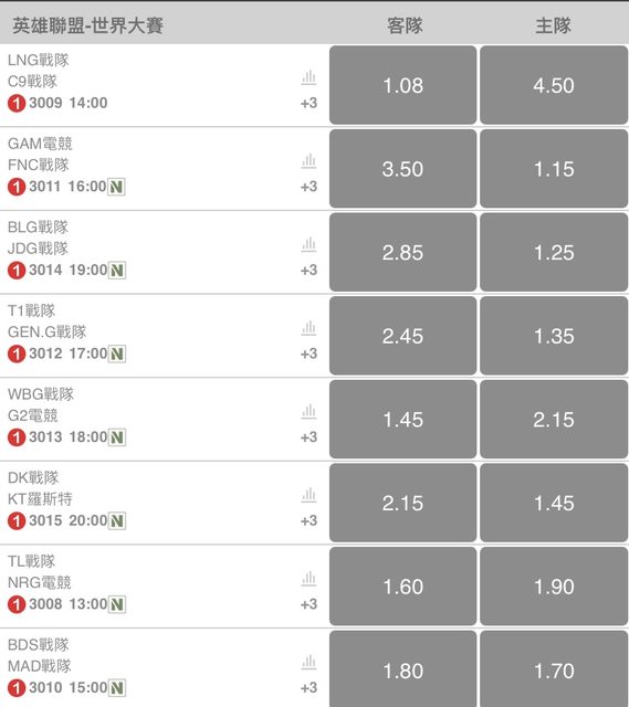 Note:主隊有選邊權 13:00 TL VS NRG 勝負 NRG 首殺 NRG 首巴龍 NRG 14:00 LNG VS C9 勝負 LNG 首殺 LNG 首巴龍 C9 15:00 BDS VS MAD 勝負 MAD 首殺 MAD 首巴龍 MAD 16:00 GAM VS FNC 勝負 FNC 首殺 GAM 首巴龍 FNC 17:00 T1 VS GEN.G 勝負 GEN.G 首殺 T1 首巴龍 GEN.G 18:00 WBG VS G2 勝負 G2 首殺 WBG 首巴龍 WBG 19:00 BLG VS JDG 勝負 JDG 首殺 JDG 首巴龍 JDG 20:00 DK VS KT 勝負 KT 首殺 KT 首巴龍 KT ----- Sent from JPTT on my iPhone -- ※ 發信站: 批踢踢實業坊(ptt.org.tw), 來自: 42.73.24.37 (臺灣) ※ 文章網址: https://ptt.org.tw/SportLottery/M.1697776230.A.979