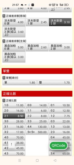 思路:看好客2球→比較下方截圖跟目前比分賠率,可以發現只有2:3是降賠的,賭賭看!