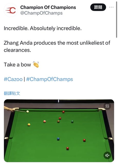 冠軍張安達在1:3丁俊暉66,再吃一套即賽末點窮途末路之下,絕境求生打出一記超乎