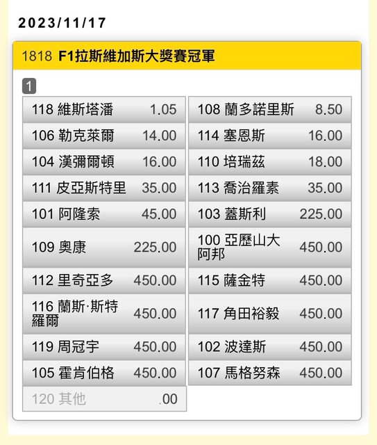 開出今季最高賠率單站冠軍;