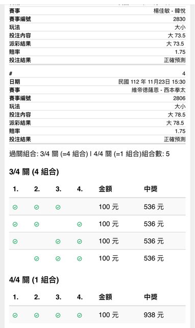 昨日推三張,倒ㄧ張保本二張 後來自己多下一張有全轟 串四3*3的好處就是倒一關還可以保本 寧願小賺 畢竟羽球很搞 小安都可以被直落二了 https://i.imgur.com/WDRiDkR.jpg