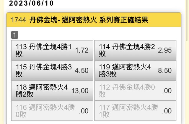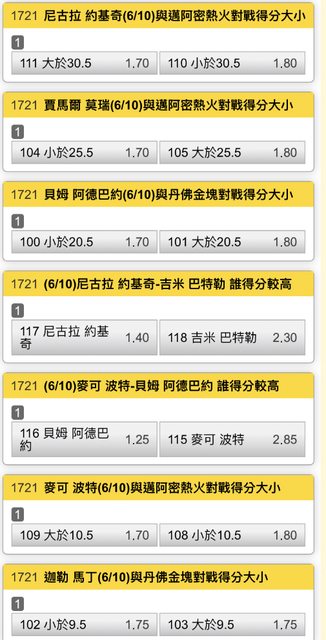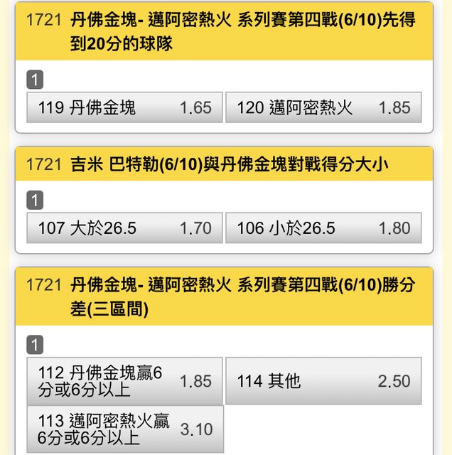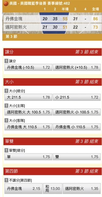 : 一 二 三 四 T : 金塊 20 35 31 22 108 : 熱火 21 30 22 22 95 : Q1開53.5->41 : Q2開52.5->65 : Q3開51.5->53 : Q4 https://i.imgur.com/D9NRrR0.jpg