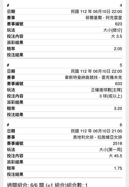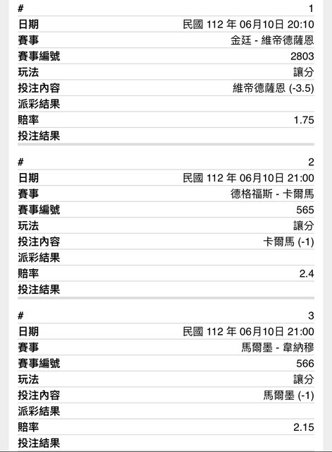 女排場 女排超婊 常常打四局開小分 這把玩個首節 首節大概率開大分 冰島足球 晚間兩場我都往大分看! 羽球 薩恩-4.5挺香的 別演就好 瑞典超 強打弱 不知道能不能都開個正盤 過讓走起 6*1 100倍 1000能換到10萬嗎 有轟抽星巴克 唷呼 -- ※ 發信站: 批踢踢實業坊(ptt.org.tw), 來自: 27.147.33.239 (臺灣) ※ 文章網址: https://ptt.org.tw/SportLottery/M.1686398699.A.DA1