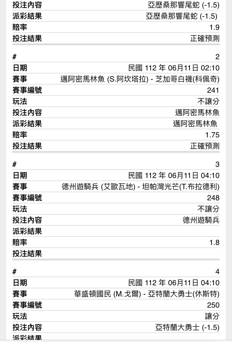 下午有刻意躲Iga對家小改玩Ace小,不知道能不能躲過…乾有夠抖 伊嘎妳輸沒關係 不要讓對手發Ace啊… 昨天7只過2 過關率急速下修中 六月份統計目前過關率 MLB:28/44 = 63.6% 網球:23/37 = 62.2% 馬林魚 VS 白襪 (推馬林魚pk) 賠率1.75 這場我看魚王回穩,因為白襪打擊真的不太可信,馬林魚雖然今天中斷連勝,整體氣勢還 是旺很多 響尾蛇 VS 老虎 (推蛇-1.5) 賠率1.90 以十二生肖來說,蛇是第六、虎是第三,這場就是6:3蛇過讓不用懷疑!! 2x1串一張 國民 VS 勇士 (推勇士-1.5) 賠率1.70 這場點下去的時候賠率還是1.80轉出來變1.70孬剛偷賠偷得有夠囂張,昨天刻意躲掉勇士 讓分,這場回歸勇士讓,前幾次受惠於勇士壓線過讓,這場依然相信他 道奇 VS 費城人 (推道奇pk) 賠率1.70 Nola投日場記得還蠻慘的,這場拼看看道奇把費城人的連勝斷掉! 遊騎兵 VS 光芒 (推遊騎兵pk) 賠率1.80 Eovaldi近期這狀態太扯了,是要拼賽揚嗎? 光芒先發在主場倒是投得不太好 美聯兩強對決,一人贏一場應該比較好看吧 3x1串一張 -- ※ 發信站: 批踢踢實業坊(ptt.org.tw), 來自: 42.77.238.184 (臺灣) ※ 文章網址: https://ptt.org.tw/SportLottery/M.1686409514.A.D28