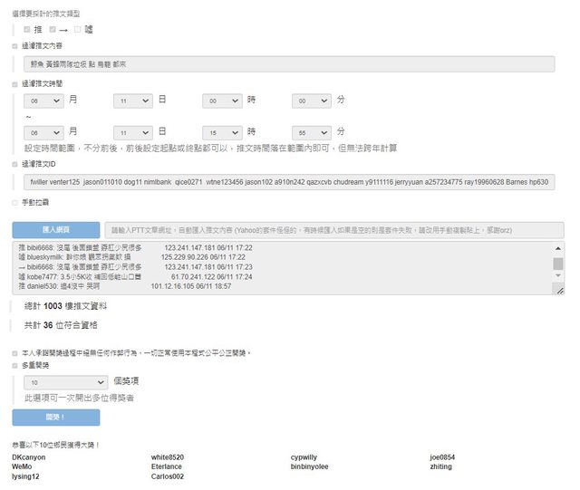 無重複帳號參與留言 DKcanyon v white8520 v cypwilly v joe0854 v WeMo v Eterlance v binbinyolee v zhiting v lysing12 v Carlos002 v 恭喜以上得獎者!! 敬請 恭喜 Venter125大 飲料明天送出~ 謝謝大家 -- ※ 發信站: 批踢踢實業坊(ptt.org.tw), 來自: 114.44.104.103 (臺灣) ※ 文章網址: https://ptt.org.tw/SportLottery/M.1686493732.A.630