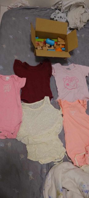物品名稱:6-9m女寶夏季衣物數件+木頭積木一小盒