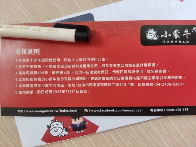 物品A:小蒙牛四人同行一人免費午餐招待券 期限7/31
