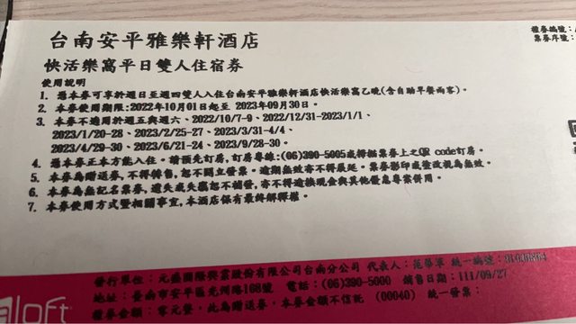 標題[交易] 台南雅樂軒酒店平日雙人住宿券